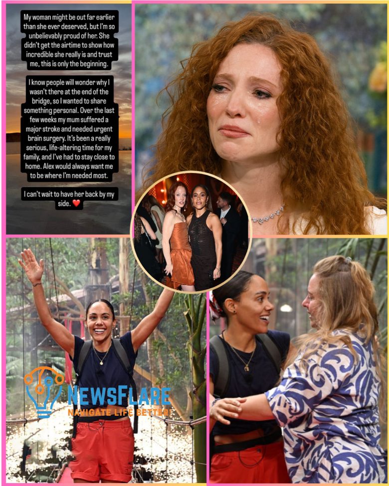 Jess Glynne has revealed she was unable to greet Alex Scott on the I’m A Celeb bridge because her mother has suffered a ‘major stroke and underwent brain surgery’