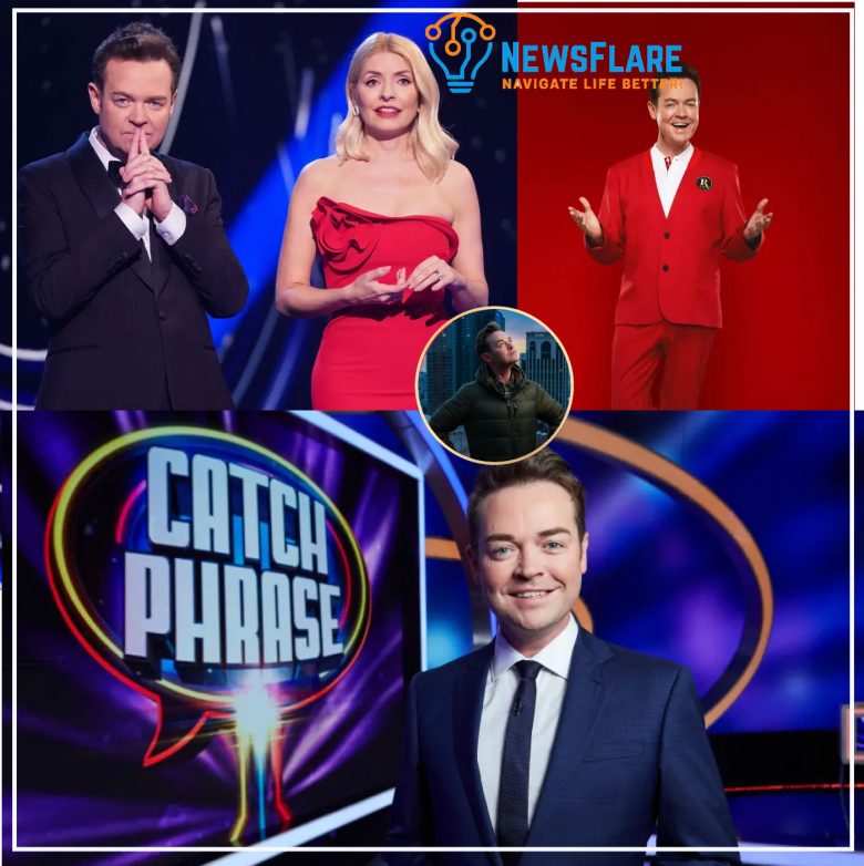 Stephen Mulhern in a blue suit and white shirt, standing in front of a Catchphrase logo on a TV set.